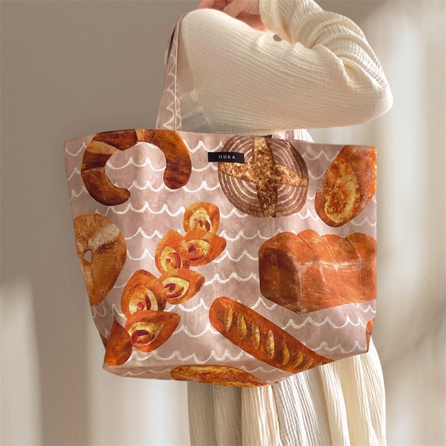 ほかほか!『焼きたてパン柄』丸底帆布トートバッグ:60日以内に発送