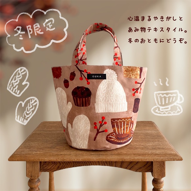 【秋冬限定】心温まる『焼き菓子と編み物柄』ビッグトート:30〜60日以内に発送