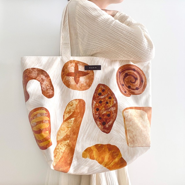 もっちり美味しそうなきなこベーグル! 三日月型がかわいいクレッセント! もぎもぎ楽しいベーコンエピ! 他にもココアのヴィエノワ、米粉のカンパーニュ、ミニ食パン、酒種クッペなど盛りだくさんのおしゃれでかわいいパンをテキスタイルにしました。 いい匂いがしてきそうなほかほかトートを持ち歩けば、 心が満たされて幸せな気分になれること間違いなしです! 一目見ると忘れられないインパクト大な柄! きっと「パンバッグの人だ‥!」と覚えられてしまいますので どうぞ覚悟してお持ちくださいませ‥笑。 地色はミルクココア色に仕上げました。 しっかりマチつきでA4も入るたっぷりサイズです。 肩がけもできる長さの持ち手になっているのでシーンに合わせてお使いいただけます。 【サイズ】 高さ:30cm(持ち手含まず) 口巾:45cm 底巾:32cm マチ:13cm 持ち手:46cm ※プリントの工程上季節によって生地の縮み具合が変わります。 サイズは目安としてご覧ください。 【生地について】 ・美しい色を緻密に表現できる昇華転写プリント手法を採用しています。 ・表地にはポリエステル帆布を使用しております。綿生地のような風合いで、シワになりにくい特徴があります。 ・2025.2月以降生地とプリント工場を変更しております。 新たな工場に合わせて色の調整は行なっておりますが、色の出方がわずかに写真と異なる可能性があります。 【注意】 ※お洗濯が可能です。 ※裏地の帆布には素材の特性上、黒やブルーなどの色糸、筋や汚れのようなものが混ざることがあります。エコの観点からもよっぽど目立つものでない限り使用させていただいております。何卒ご了承くださいませ。 ※プリント生地にわずかに線や汚れのようなものが入ることがあります。 ※アイロンは低音であて布をしておかけください。長時間のスチームアイロンなどはおやめください。 【納期について】 当店はほとんどの作品が受注生産でのお仕立てとなっております。 資材の価格が高騰する中で、現在のお値段を維持するために複数のお客様のご注文品をある程度まとめてから工場にプリント依頼をかけております。 そのため最大で60日お待ちいただいておりいます。何卒ご了承くださいませ。 【キーワード】 /手描き/ミニバッグ/暮らし/誕生日プレゼント/ギフト/女性/ハンドメイド/布バッグ/ハンドバッグ/日本製/バケツトート/可愛い/丸底/母の日/帆布トート/おしゃれ/鞄/北欧/ピクニックバッグ/お買い物バッグ/入学祝い/お揃い/OUKA/おうか/オウカ/OUKAテキスタイル/クリスマス/冬/オーナメント/ミナペルホネン好きさんにおすすめ/手描き/ほっこり/ナチュラル/コットン/プレゼント/お母さん/彼女/お菓子/食べ物/