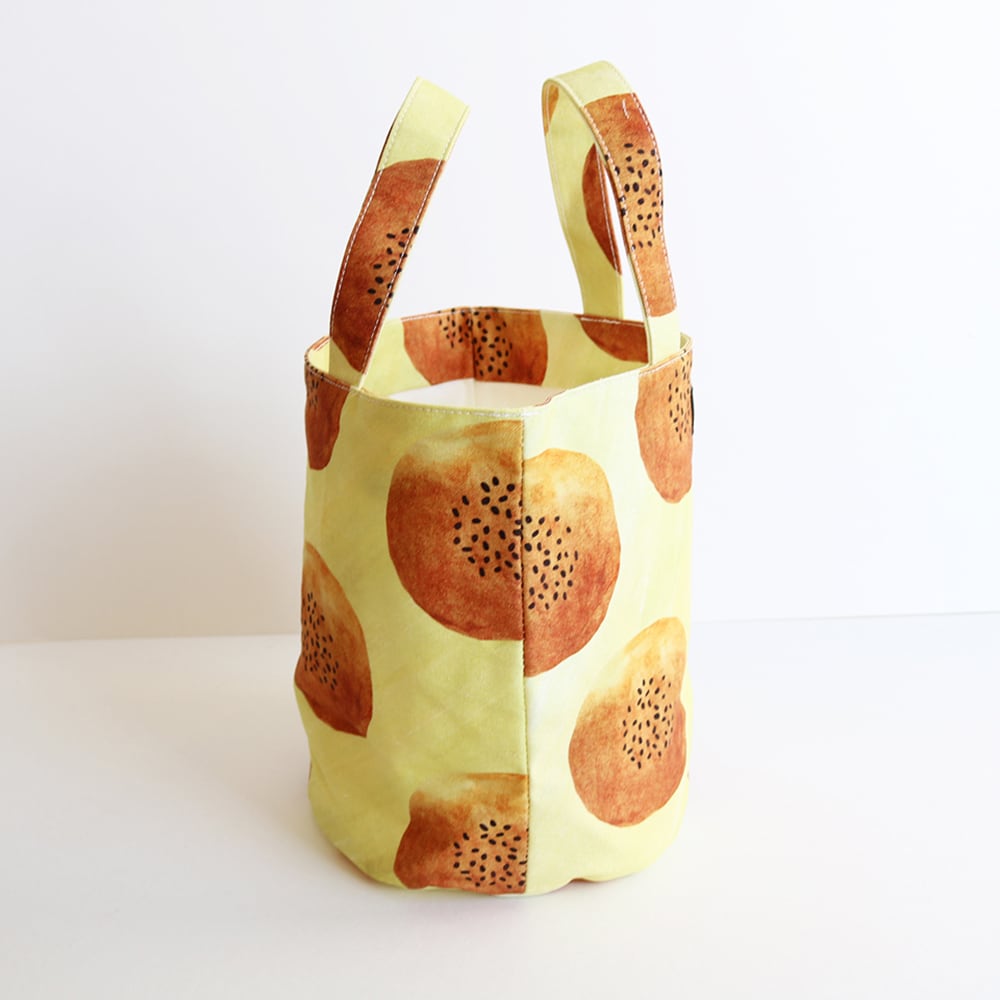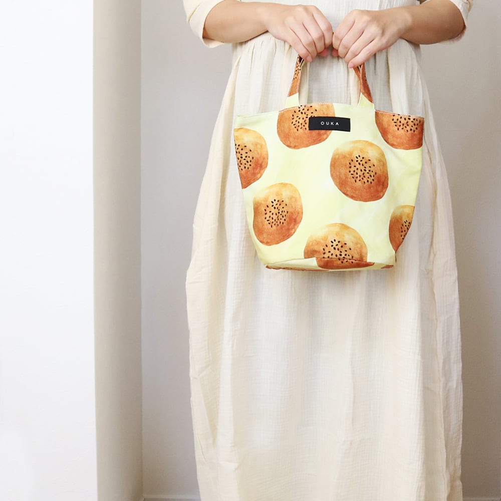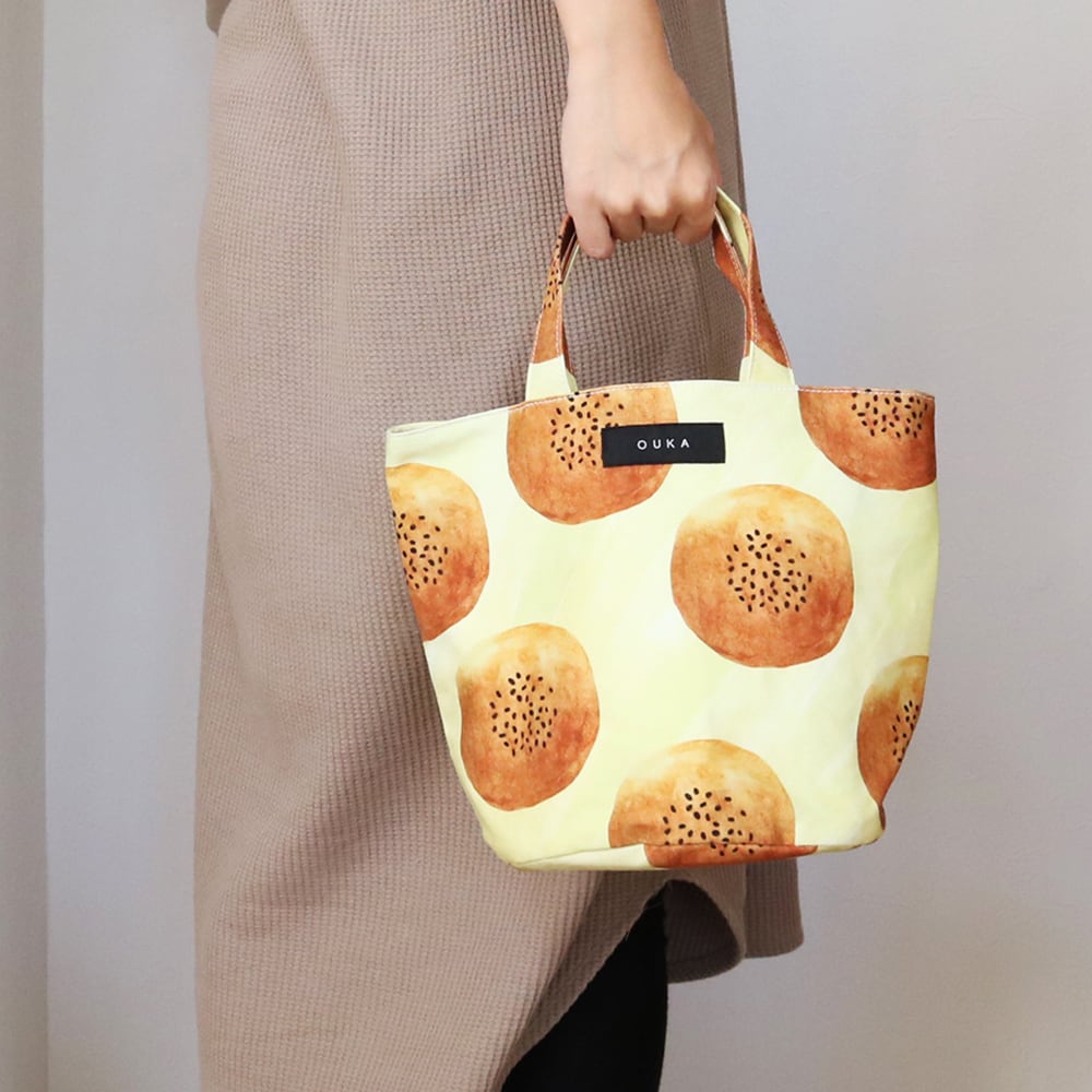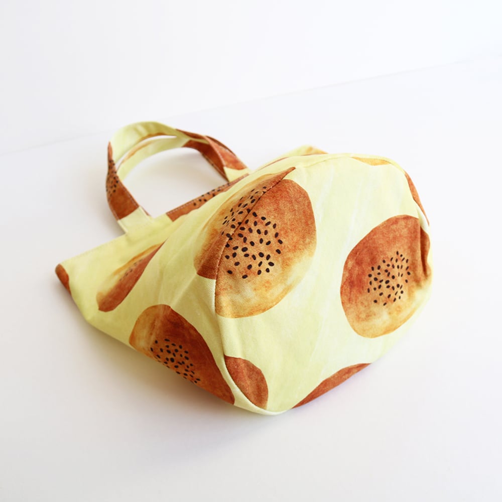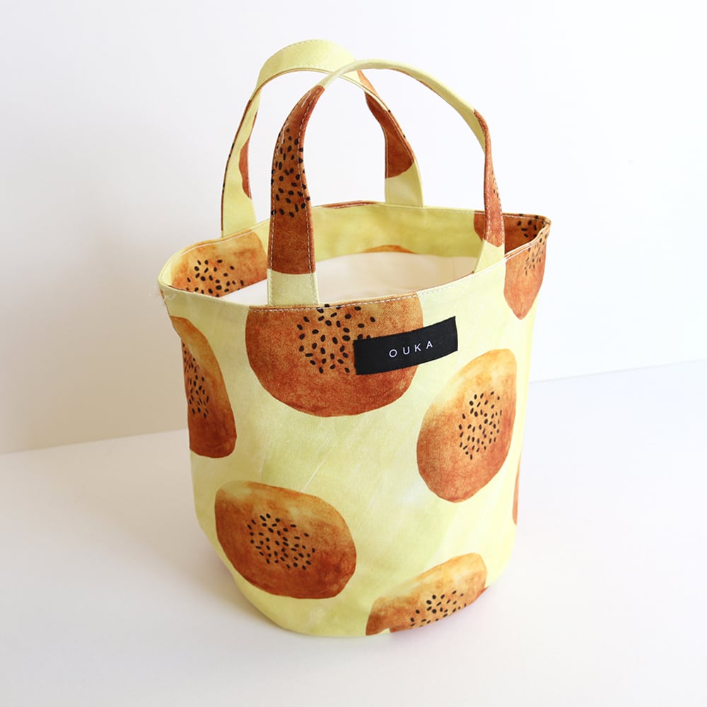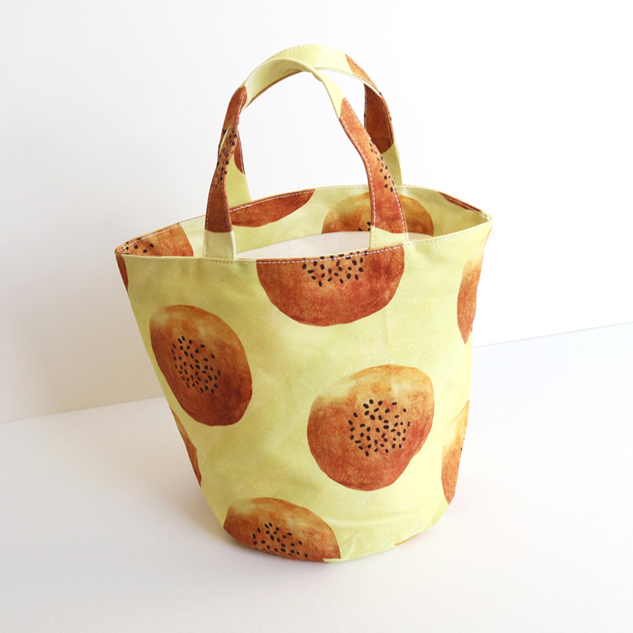 黒いゴマがお茶目なあんぱん柄テキスタイルの丸底トートバッグ。