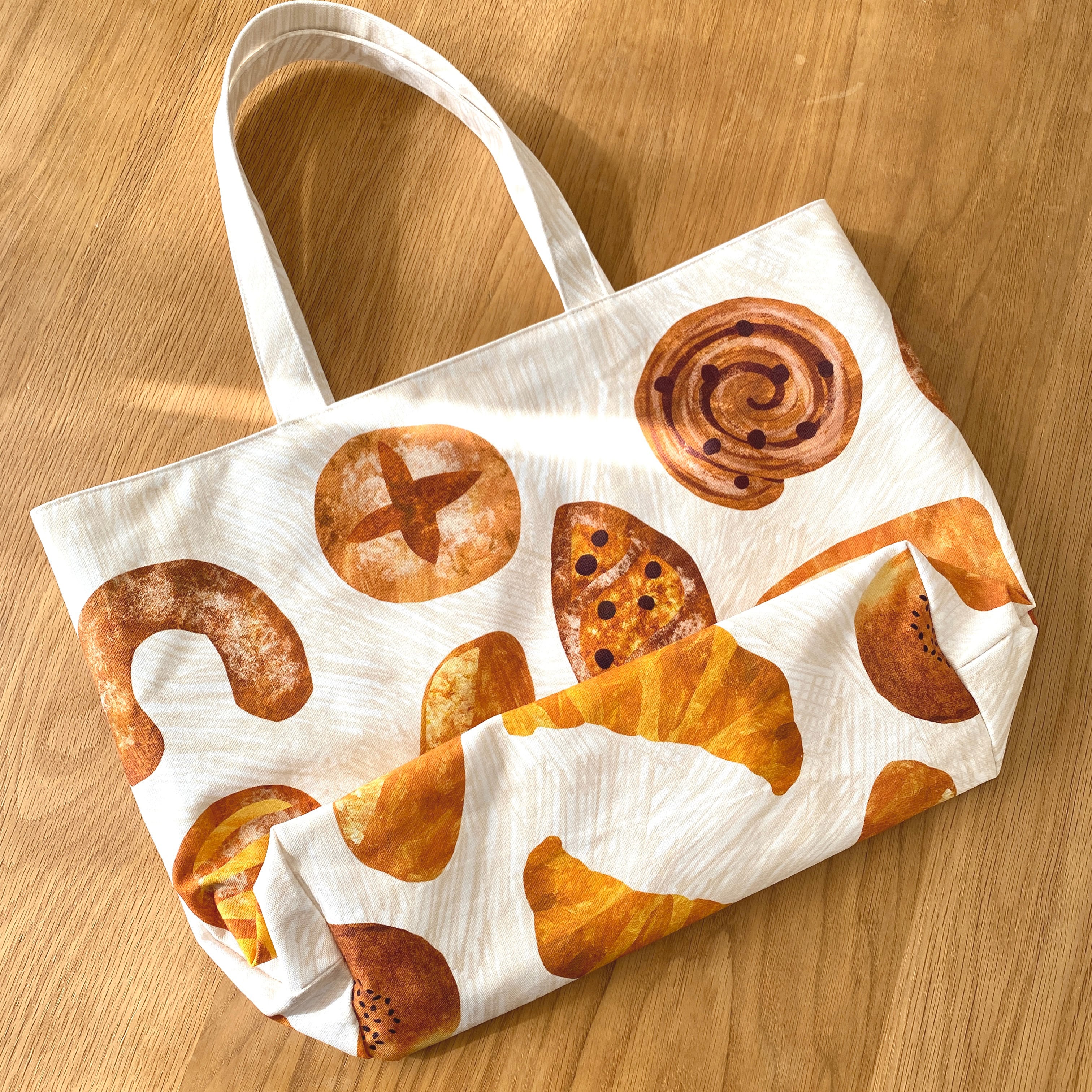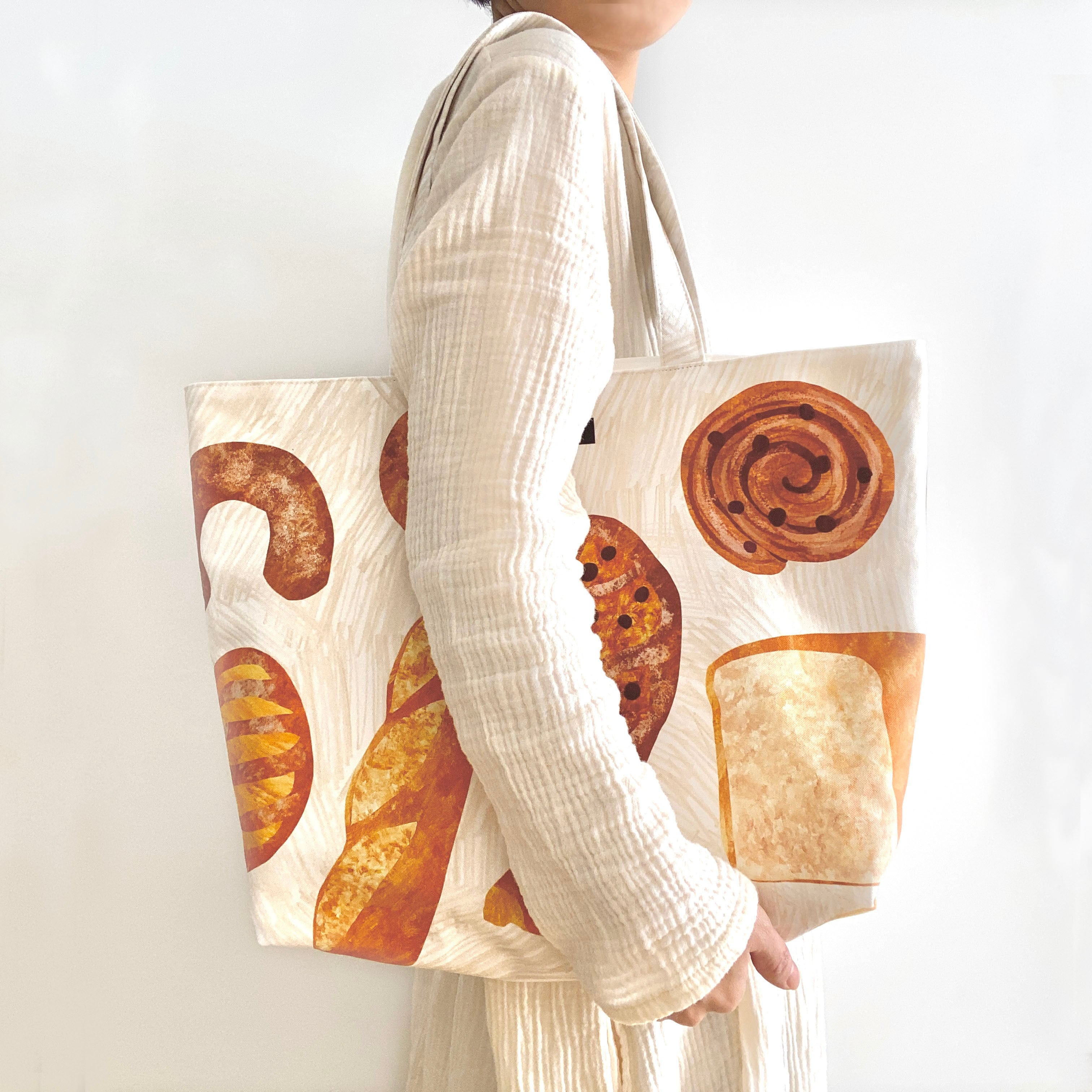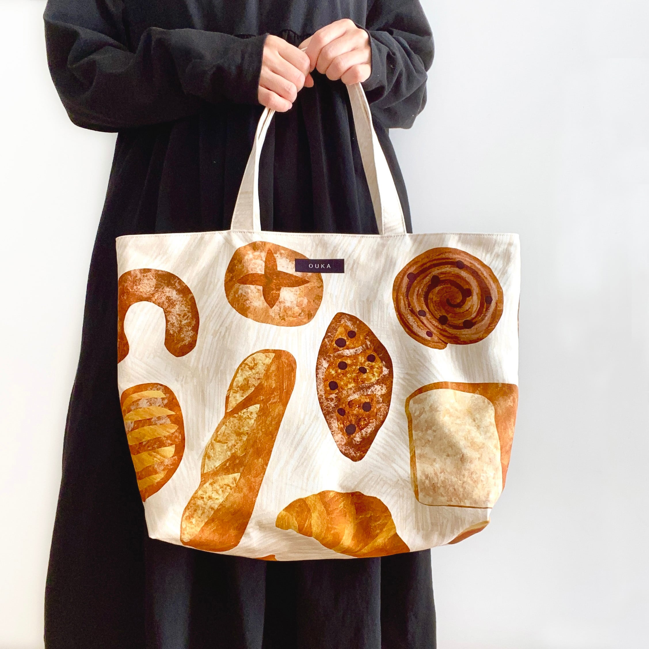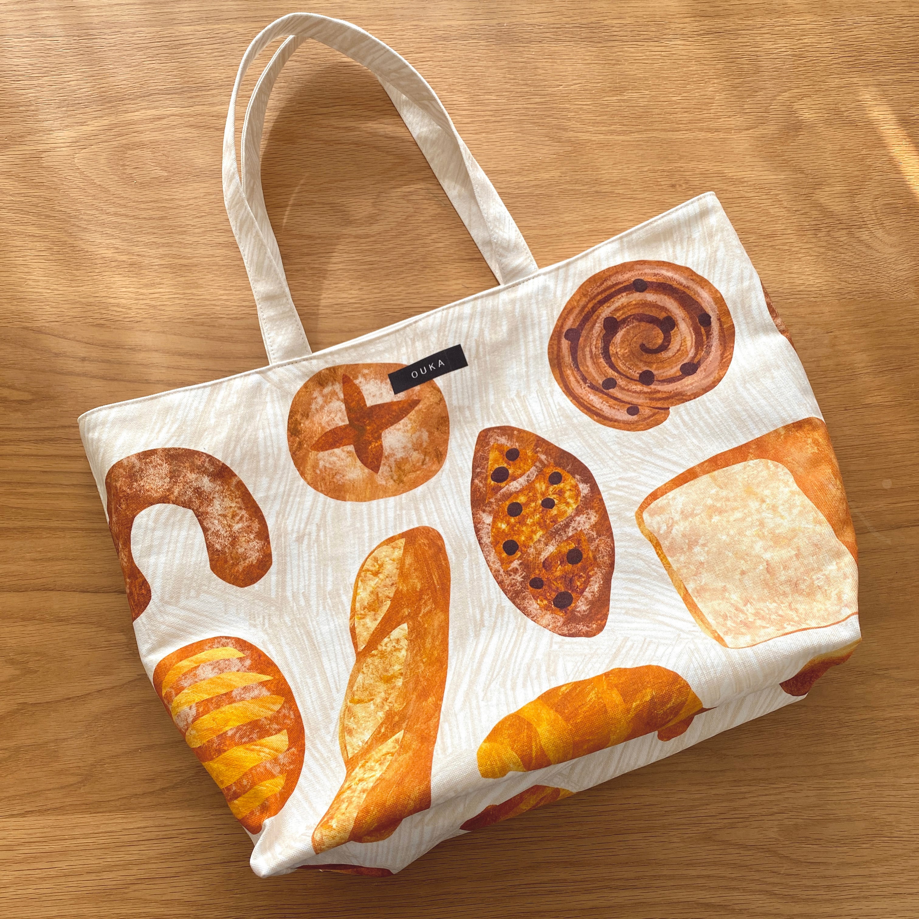 OUKA おうか オウカ テキスタイル パン柄 クロワッサン 食パン フランスパン バゲット バタール レーズンパン ハードパン 大容量 ショルダー 友達 プレゼント 肩がけ 旅行 母の日 パン屋 カフェ エコバッグ 保育園バッグ おでかけ 大荷物 通勤 通園 絵本トート マザーズバッグ 入園入学2024 レッスンバッグ 入園バッグ