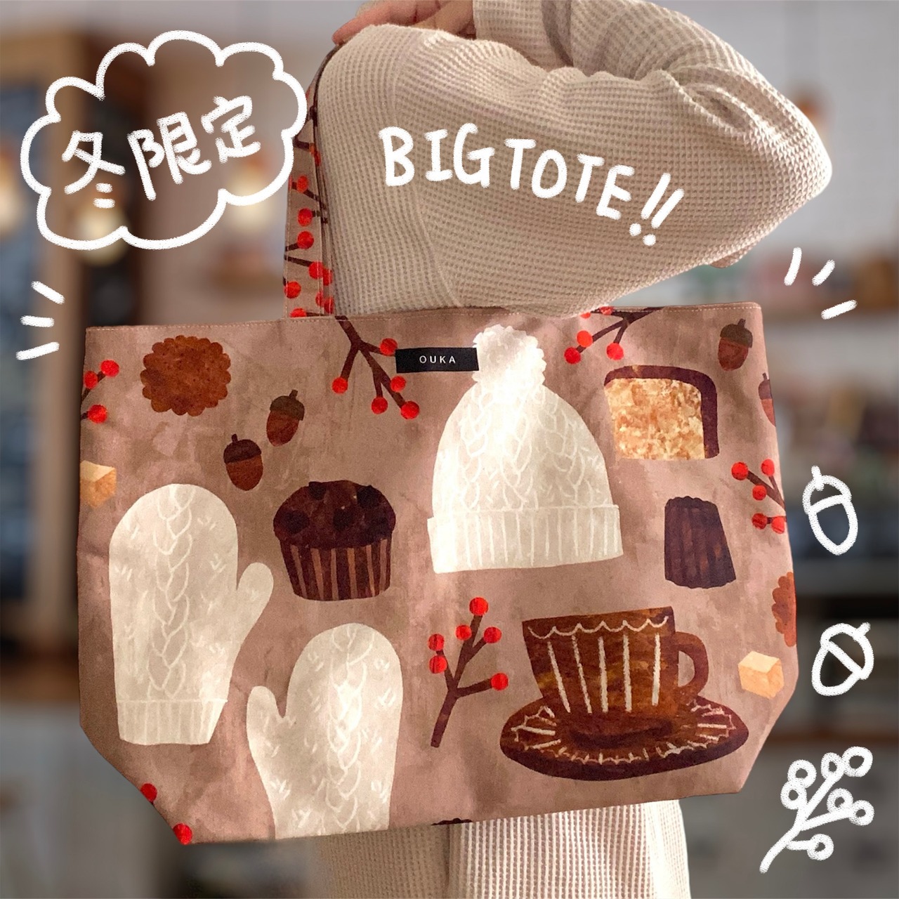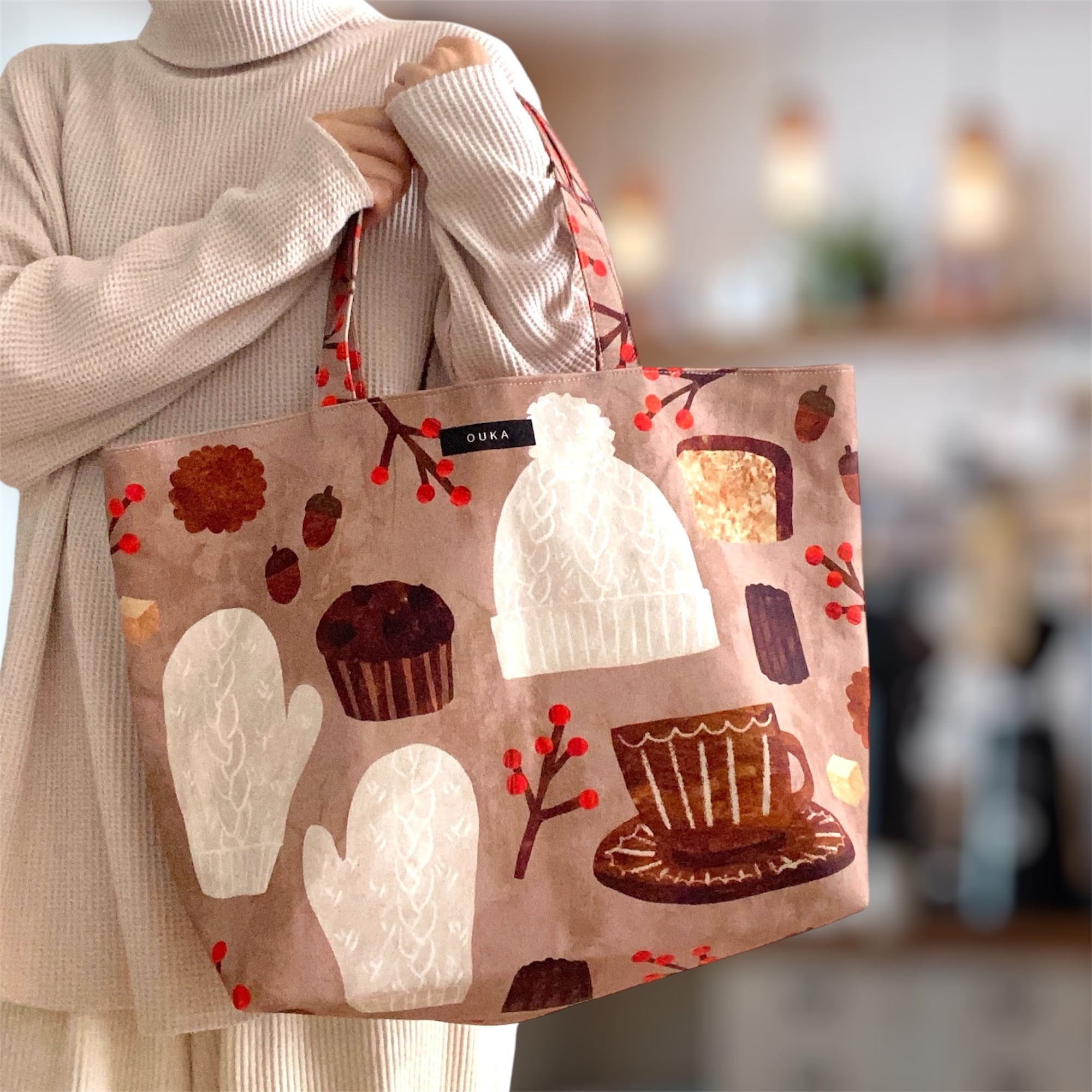 /手描き/ミニバッグ/暮らし/誕生日プレゼント/ギフト/女性/ハンドメイド/布バッグ/ハンドバッグ/日本製/バケツトート/可愛い/丸底/母の日/帆布トート/おしゃれ/鞄/北欧/ピクニックバッグ/お買い物バッグ/入学祝い/お揃い/OUKA/おうか/オウカ/OUKAテキスタイル/クリスマス/冬/オーナメント/ミナペルホネン好きさんにおすすめ/手描き/ほっこり/ナチュラル/コットン/プレゼント/お母さん/彼女/お菓子/食べ物/焼き菓子/カヌレ