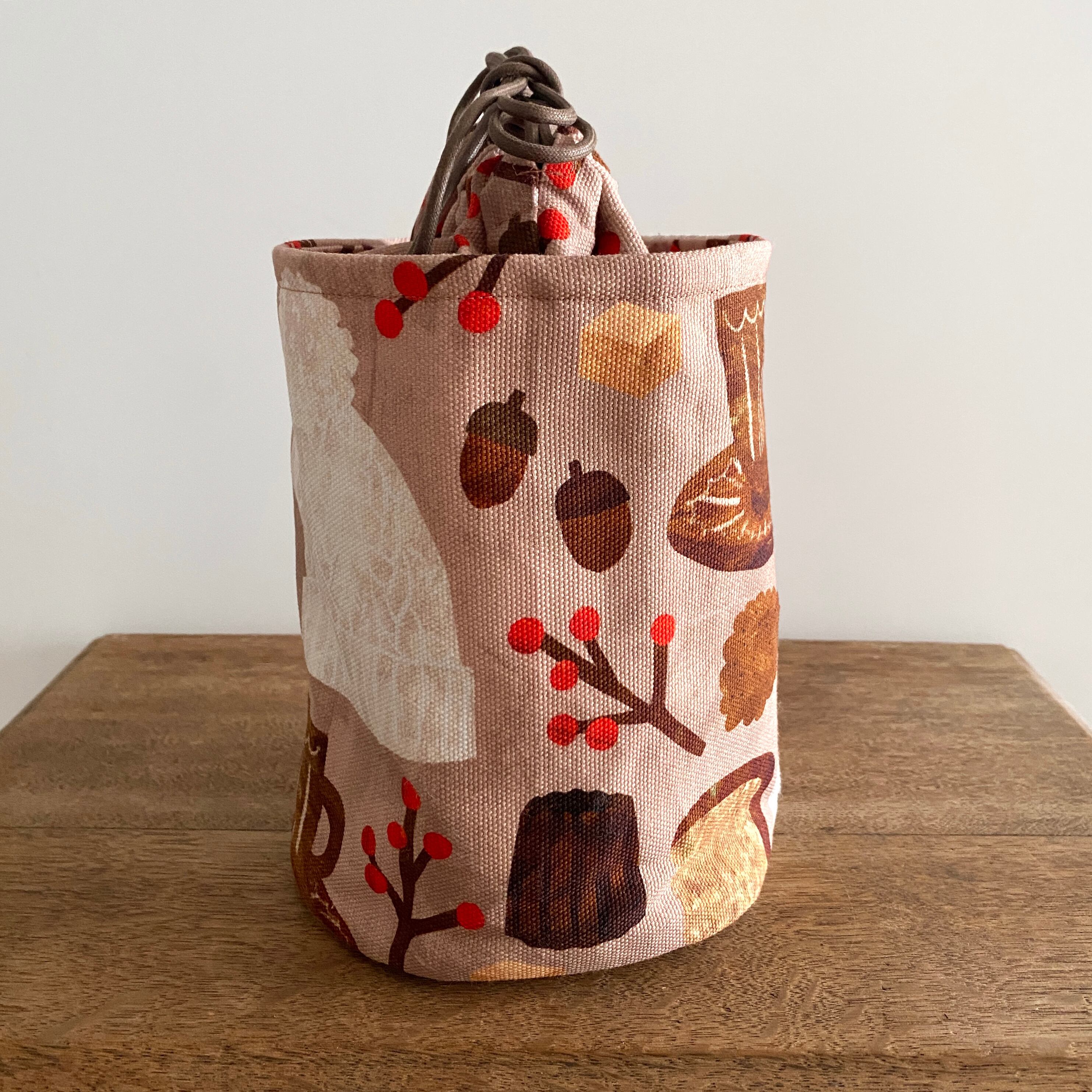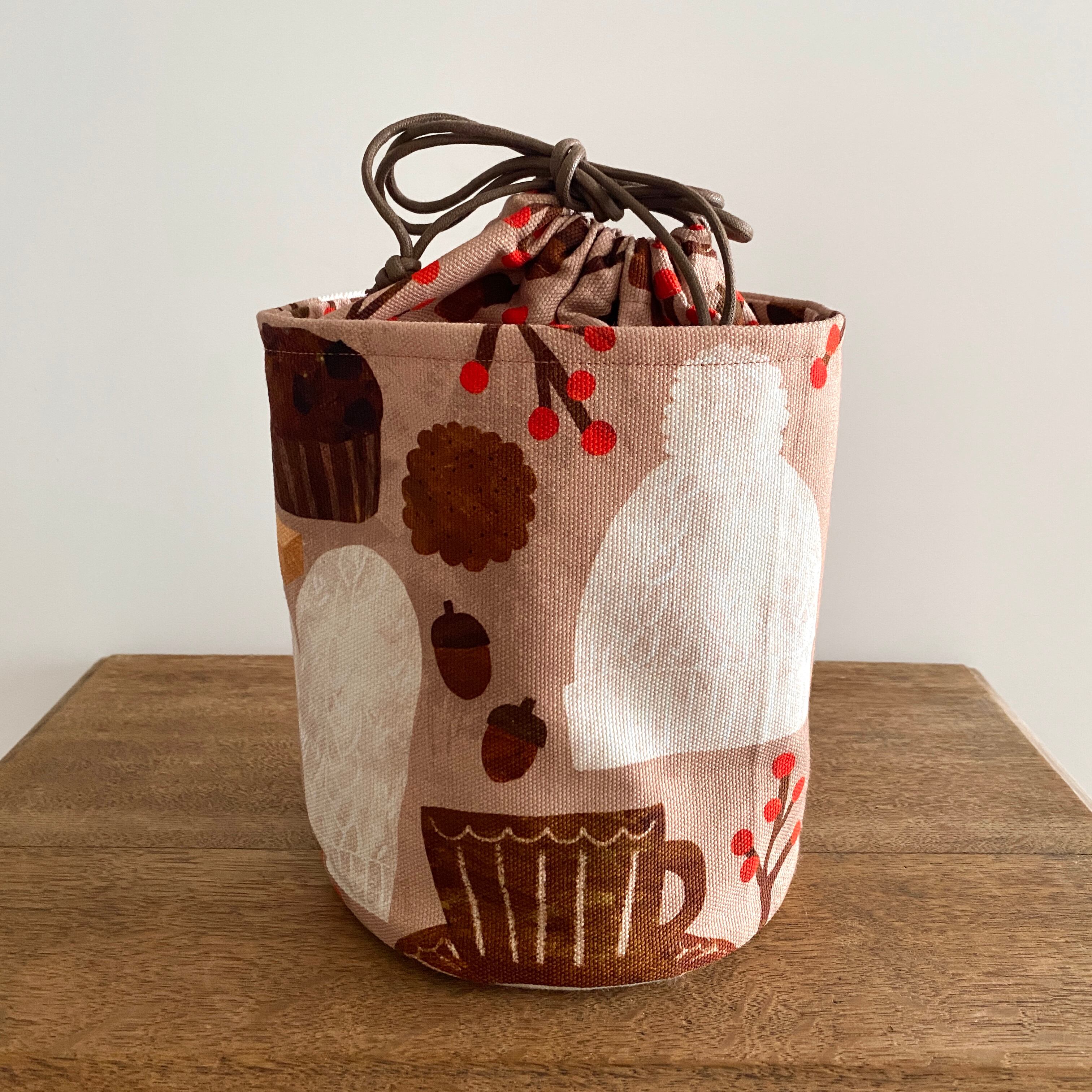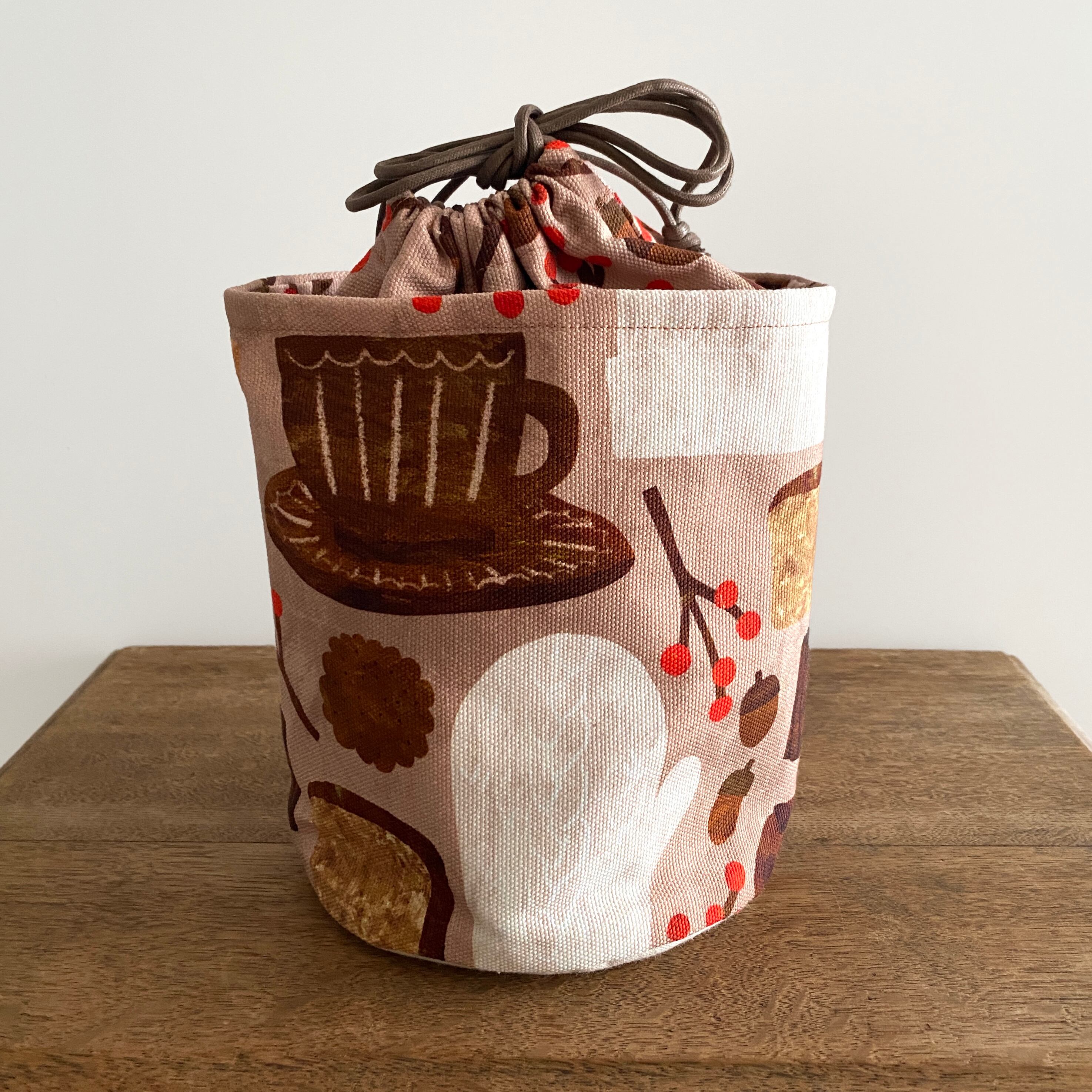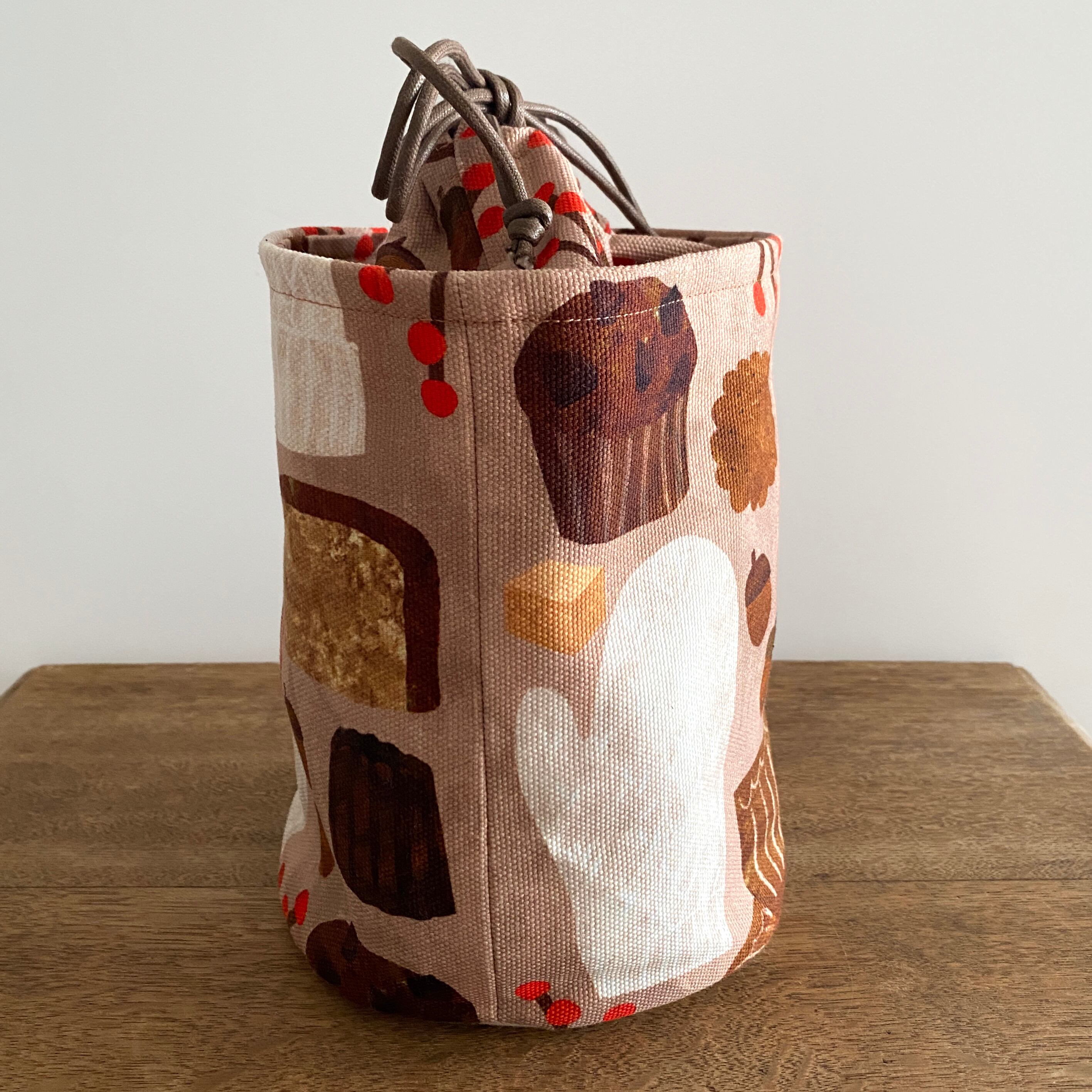 内側の巾着は、心までほっとあたたまる「焼き菓子と編み物」柄。