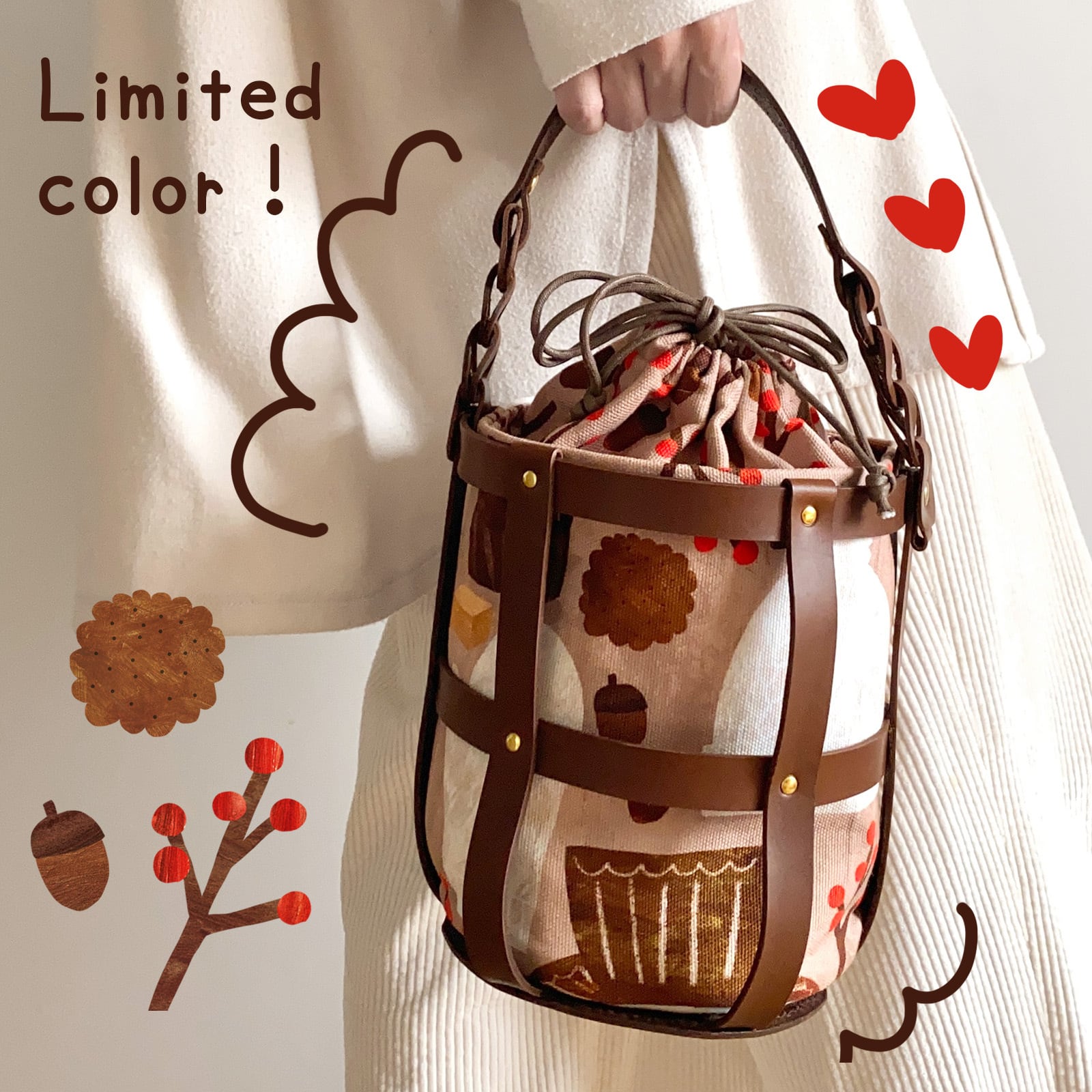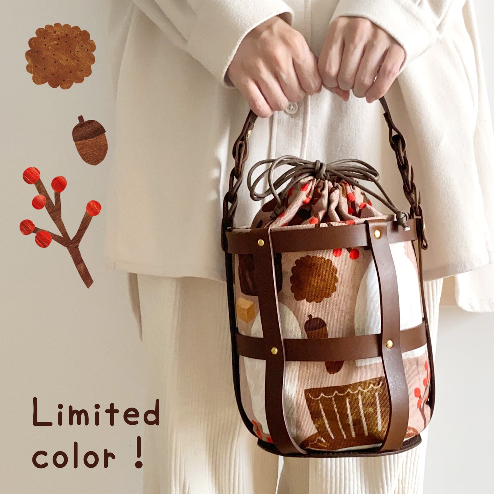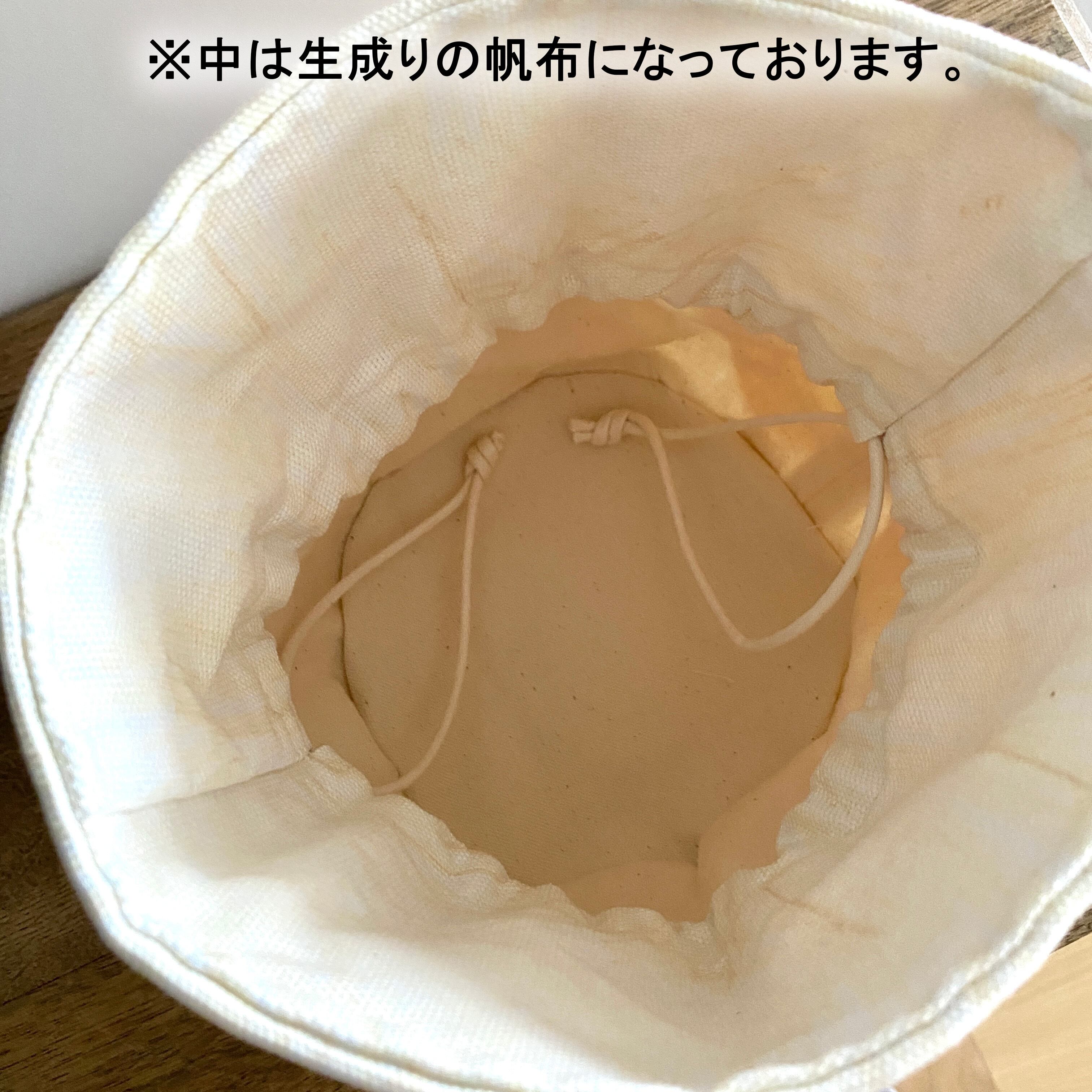 キャンバス生地でしっかり仕立てた巾着をすっぽり入れており、たくさんものを入れて巾着を絞っても可愛いシルエットになるようにデザインしています。