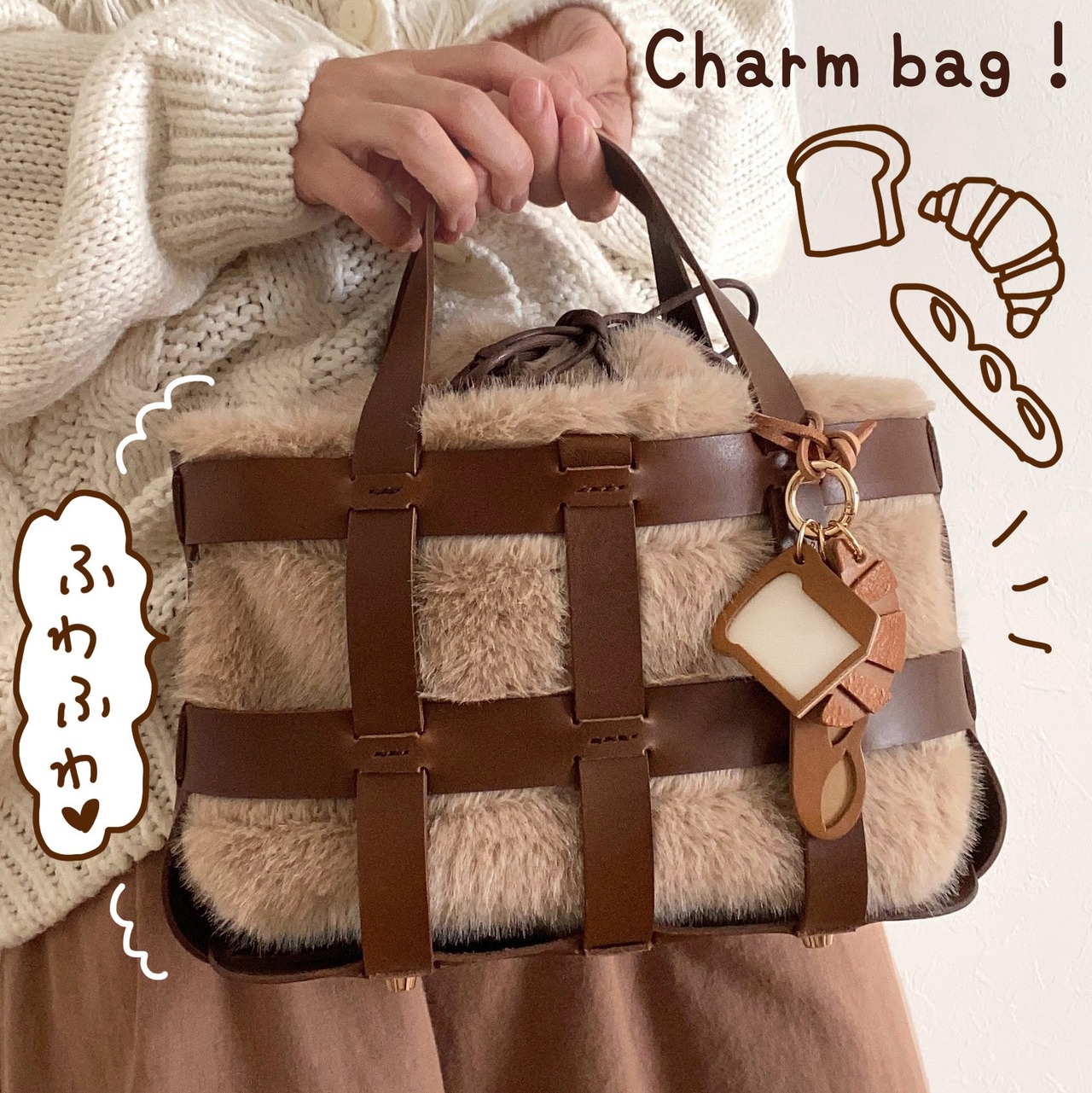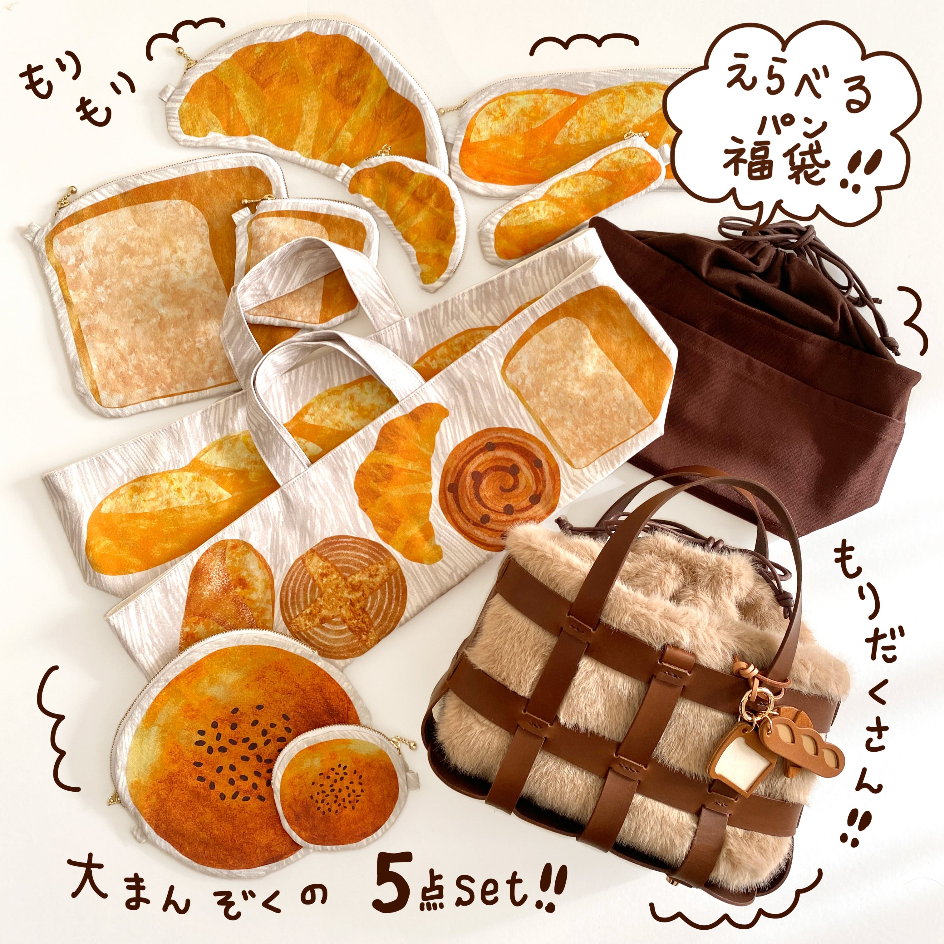 OUKAで人気のパンチャーム付きファー巾着バッグ、替え巾着、パンを並べて入れられる横長トート、新作のでかパン&ミニパンポーチがセットになったお得な福袋です!
