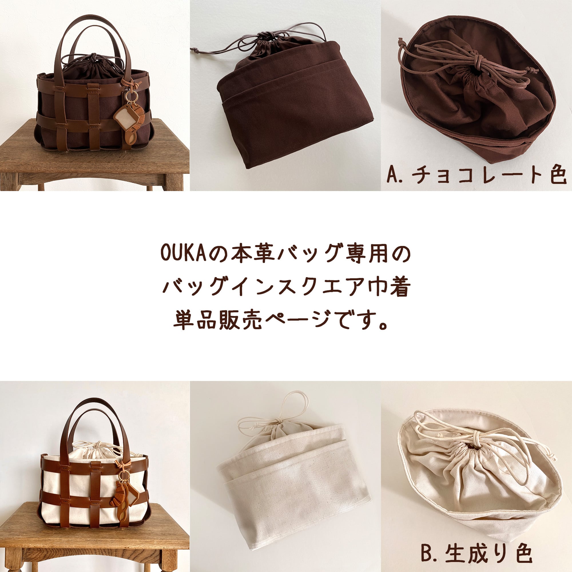 本革スクエアかごバッグ用の入れ替え巾着単品販売ページです。 A、Bの中からお選びいただけます。 サイズなどの詳細は本革バッグページを参照くださいいませ。