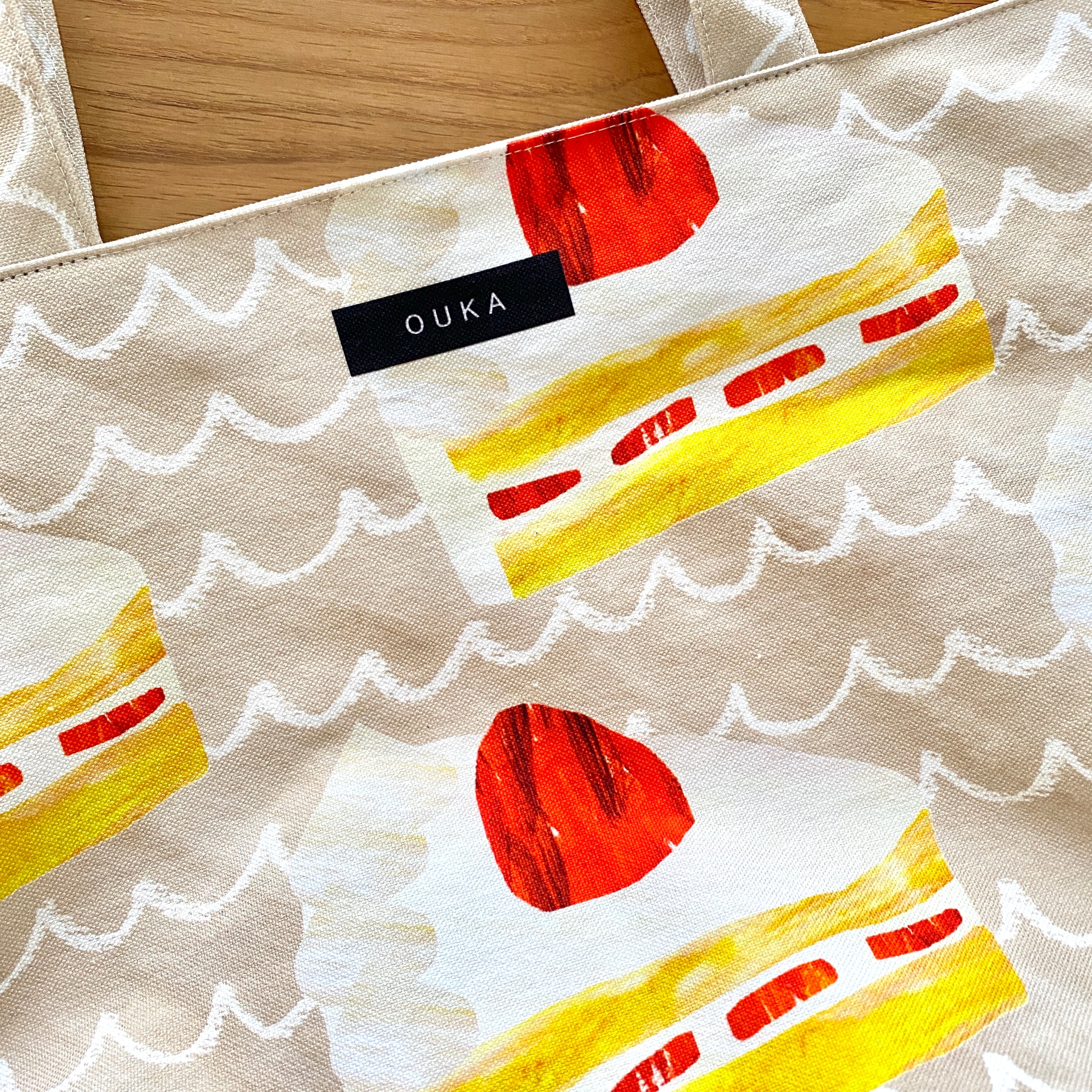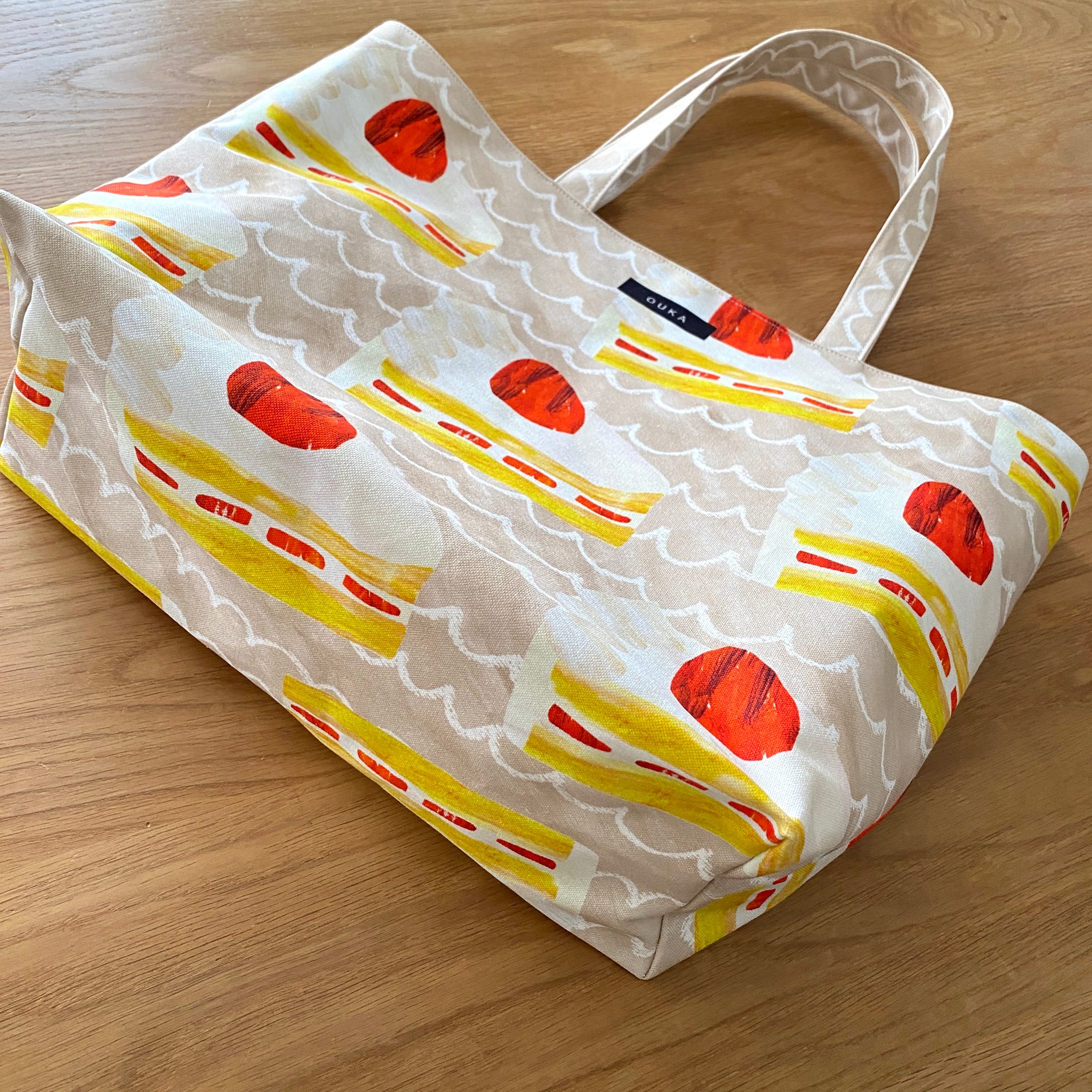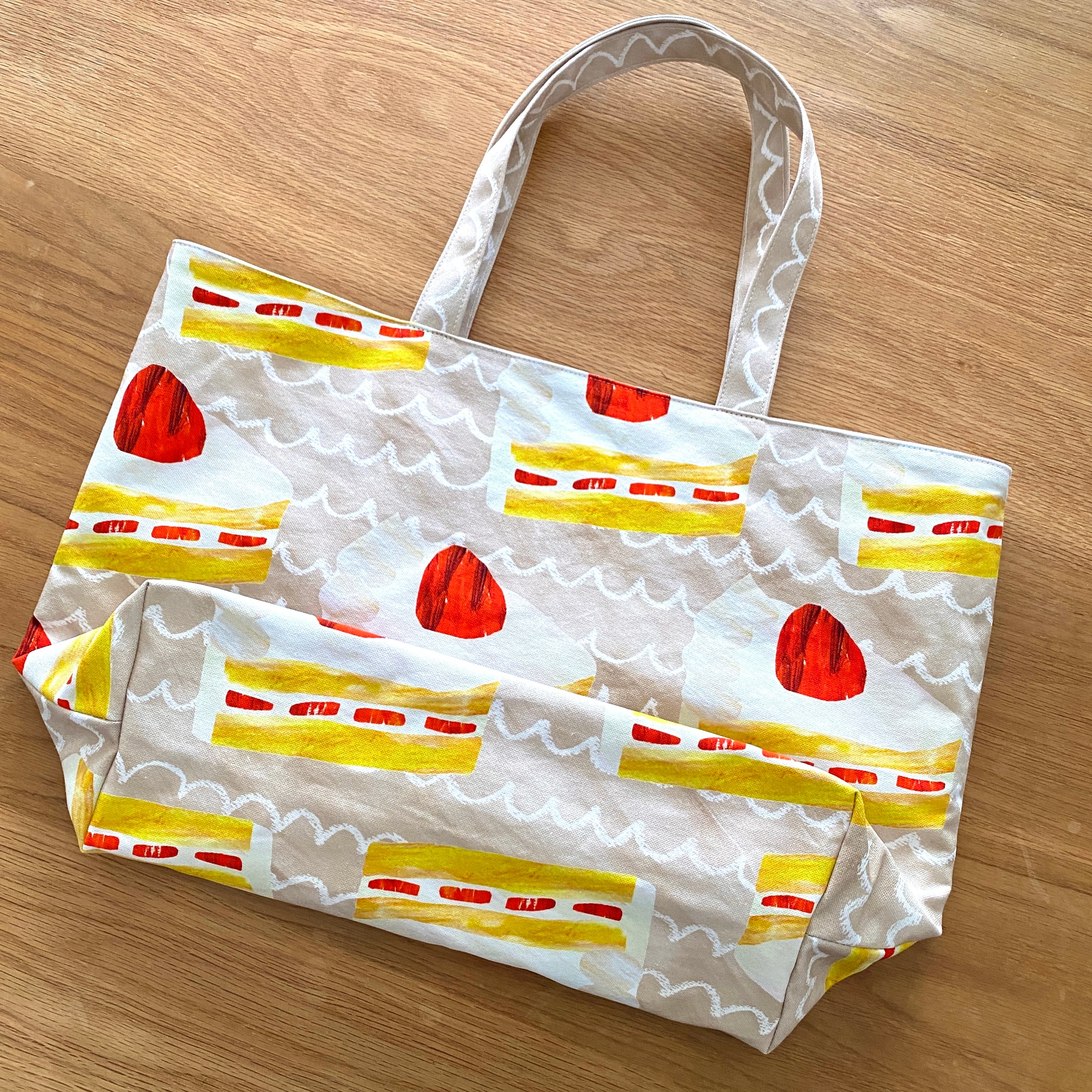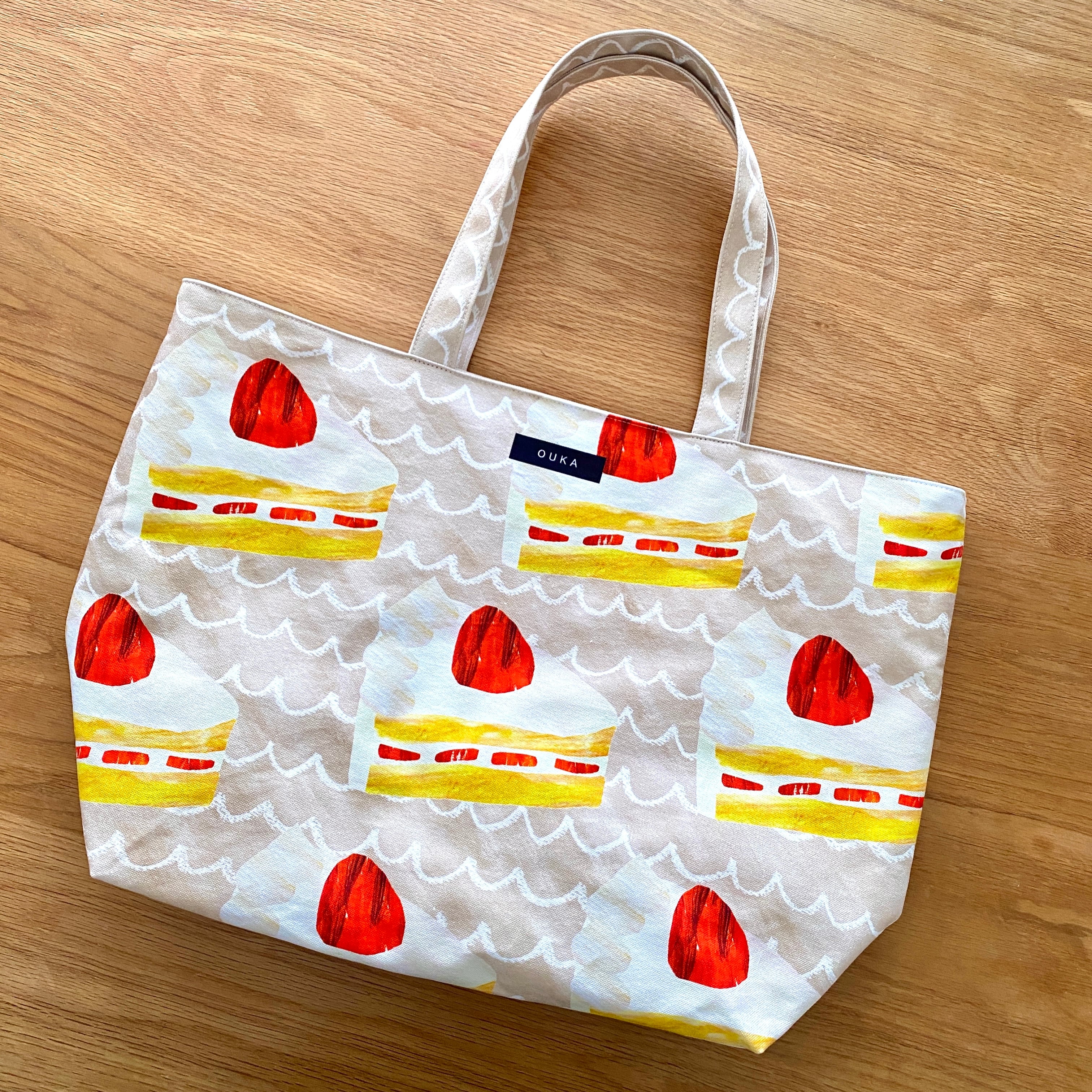 絵本から飛び出てきたような可愛らしいいちごショートケーキをモチーフにしたビッグトートバッグです。
