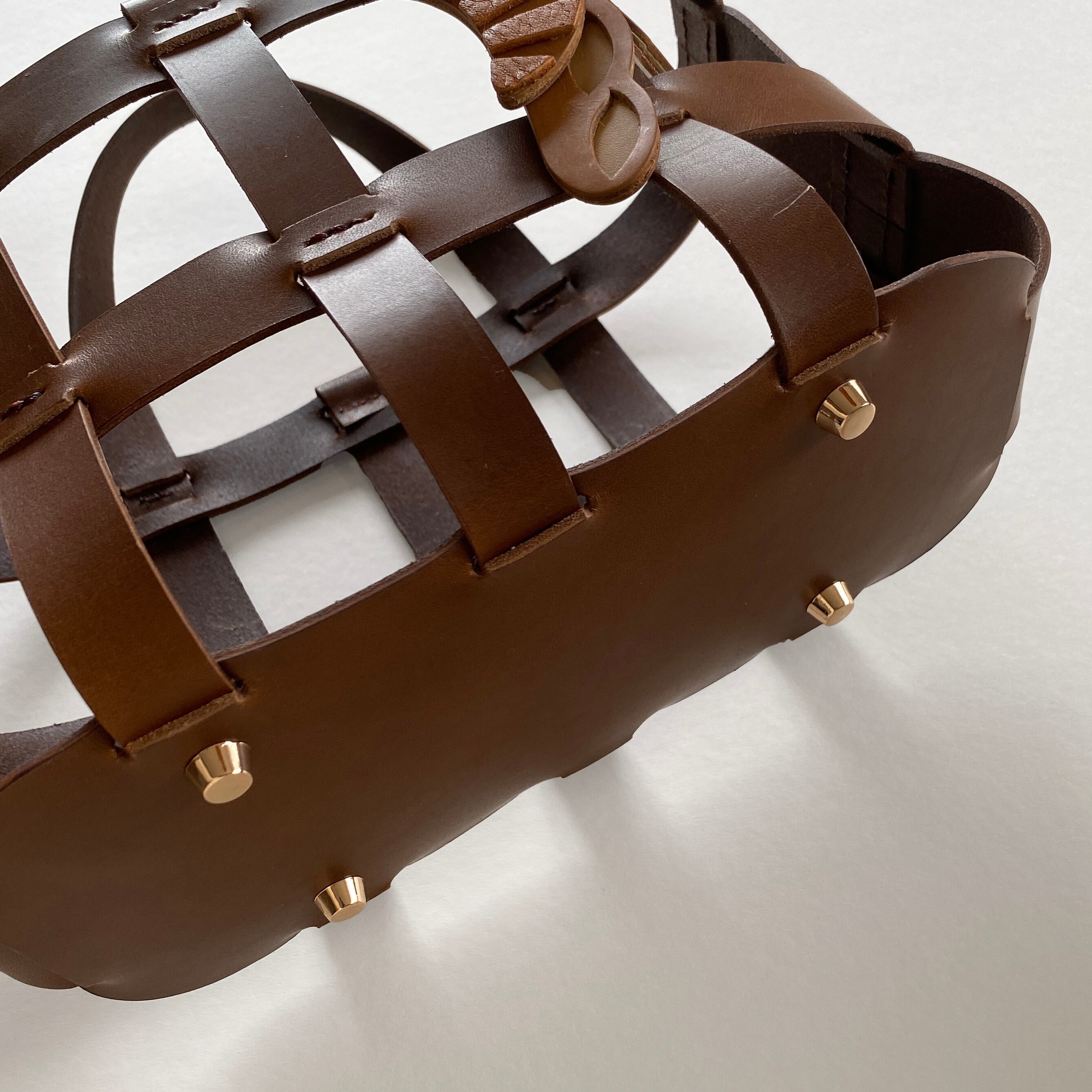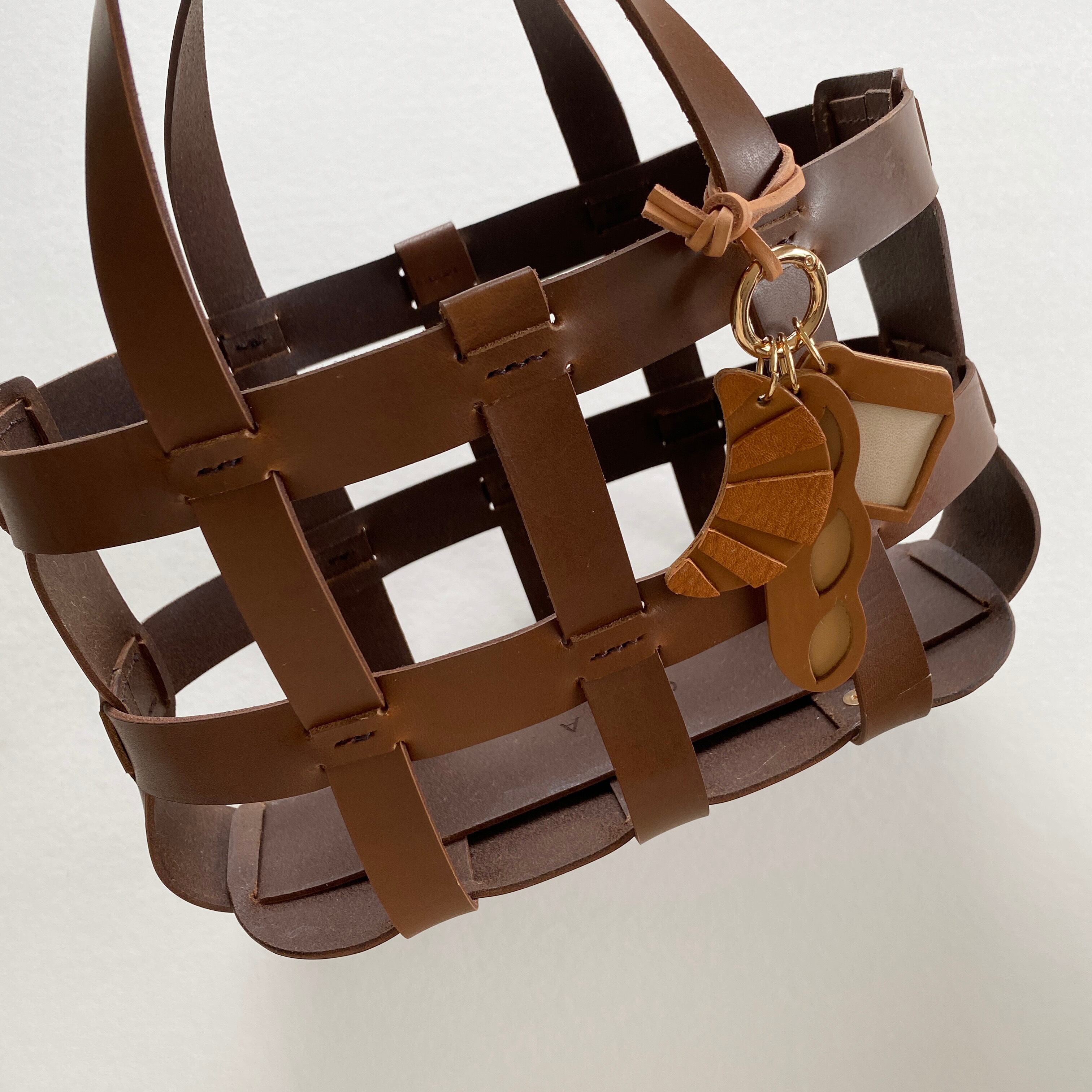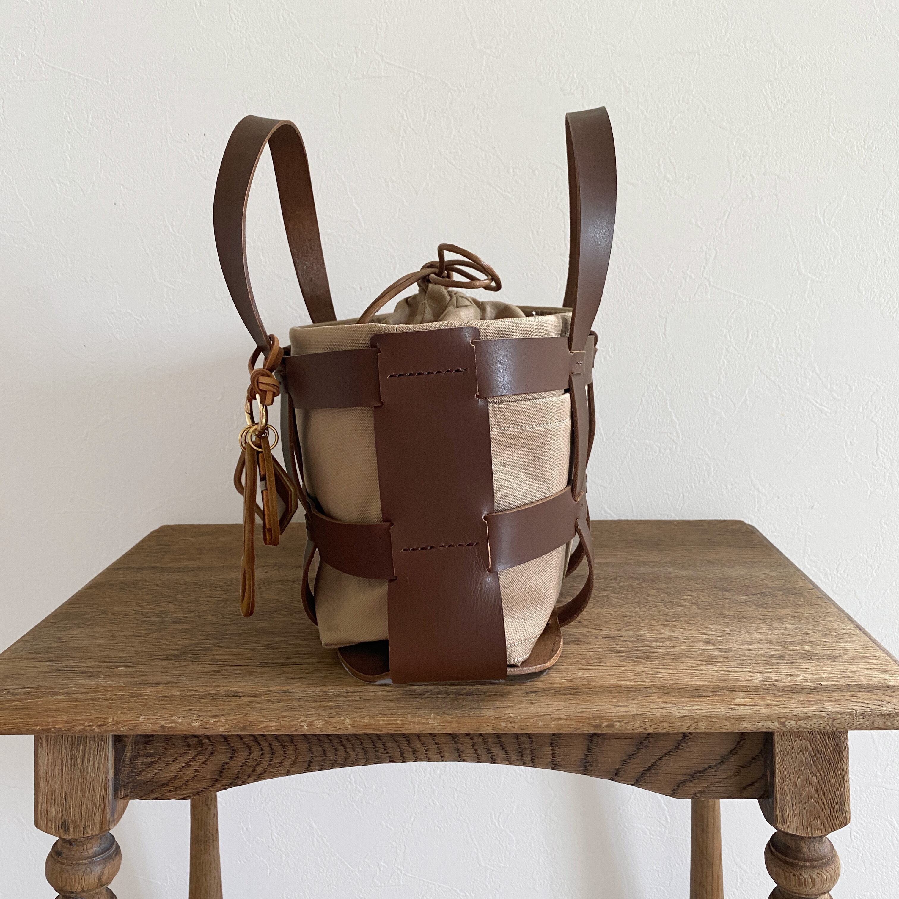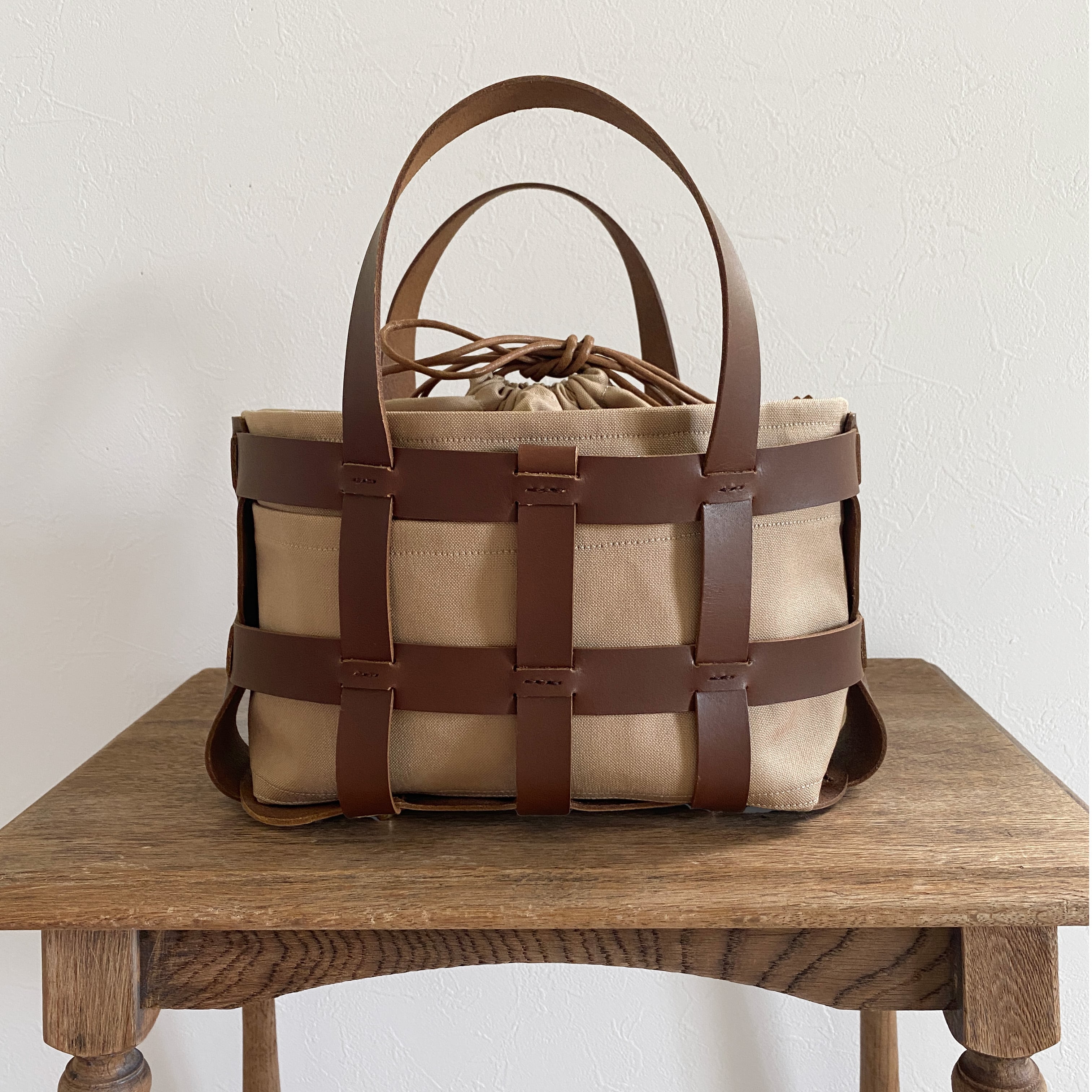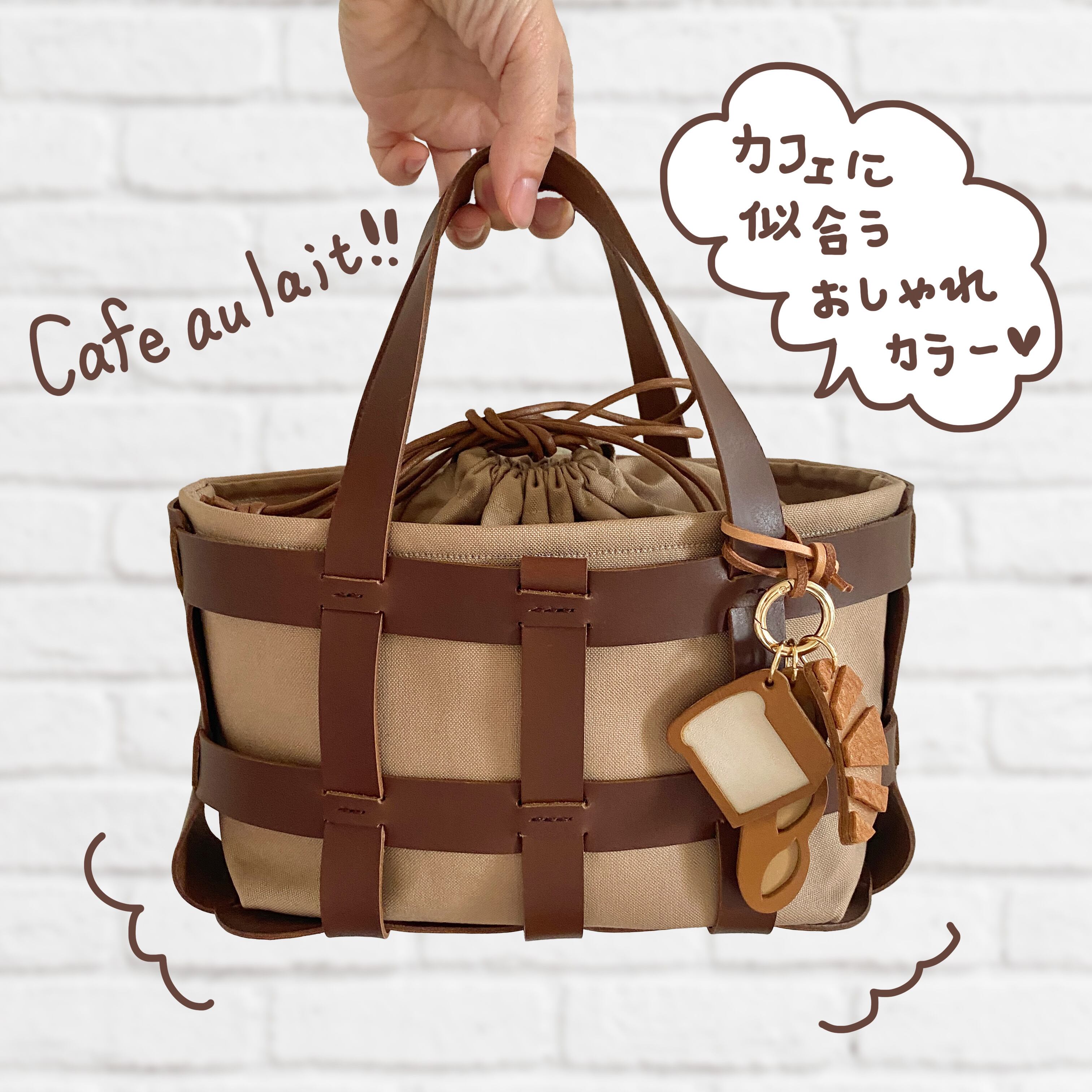 やさしくまろやかな カフェオレ色 の巾着を合わせた、本革スクエアかごバッグが新登場!